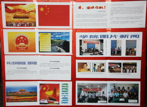 为了迎接祖国六十三周年诞辰,本期宣传栏刊载了中华人民共和国国旗、国徽和国歌的图片,以及国旗、国徽和国歌含义与产生过程简介,宣传栏还刊载了讴歌祖国的文章《看,国旗在飘!》。在《学院图片新闻》栏目,刊载了学院近期各项活动的照片,包括学院教师在校教师节大会上受到表彰的照片,学院党委书记刘振航出演电视剧《母子师生》并在天津电视台都市频道播出的视频截屏,学院表彰在校院两级教学基本功大赛上获奖青年教师的照片,学院学生代表学校参加IEEE电脑鼠走迷宫大赛等竞赛取得佳绩的照片等。