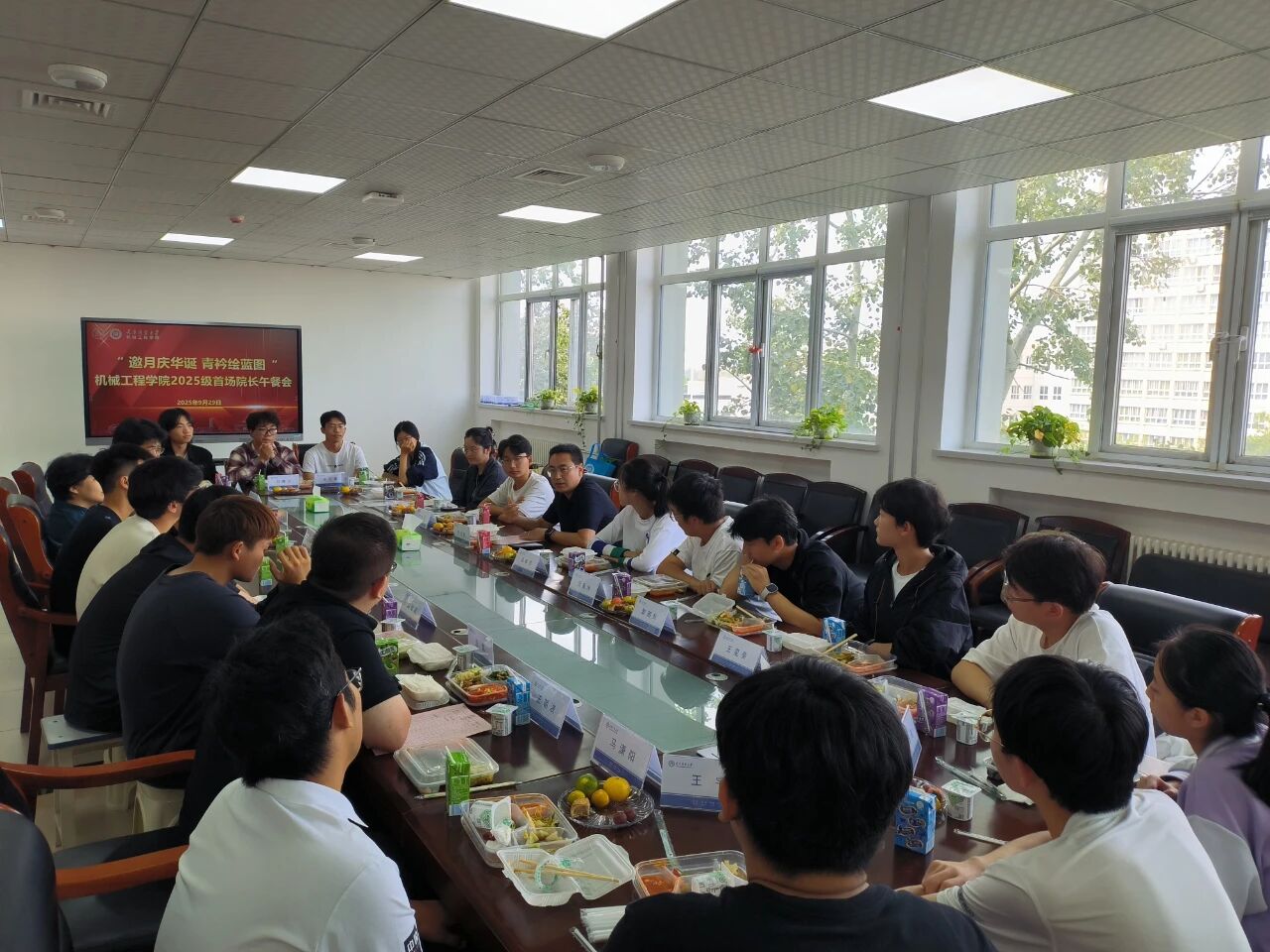 9月29日中午,机械工程学院在1号实验楼502会议室举办“邀月庆华诞 青衿绘蓝图——2025级新生院长午餐会”。学院党委书记张莹、院长刘圣春、党委副书记王凯以及2025级新生辅导员李锦田、申航源与21名2025级新生代表共进午餐,共话成长。