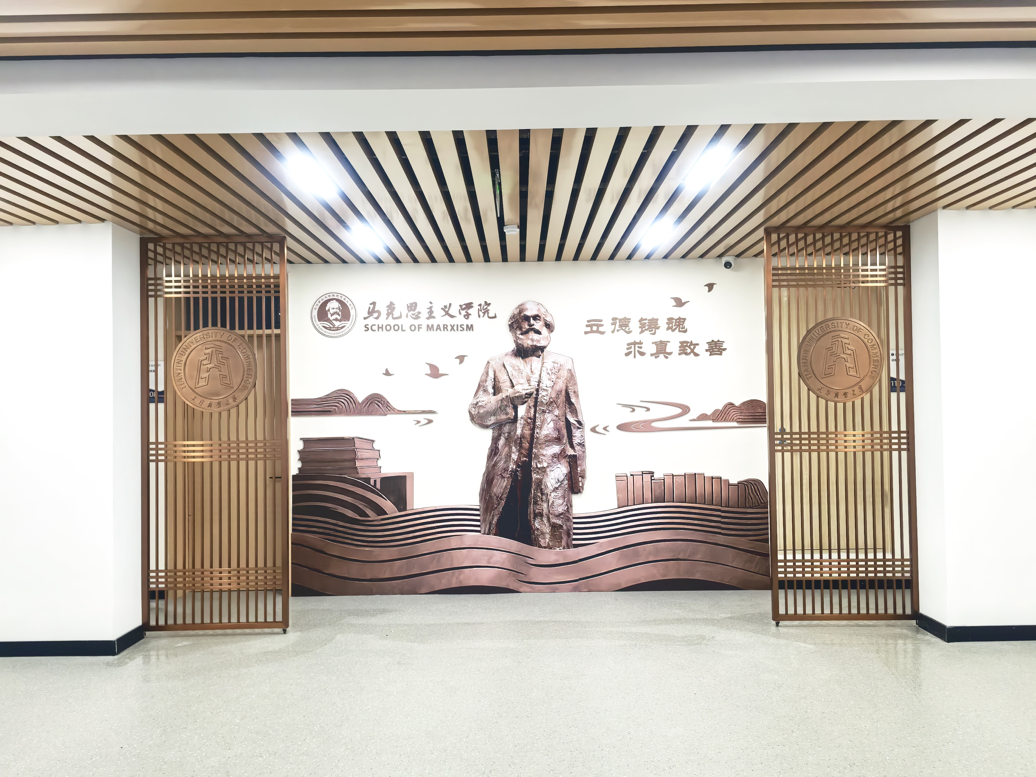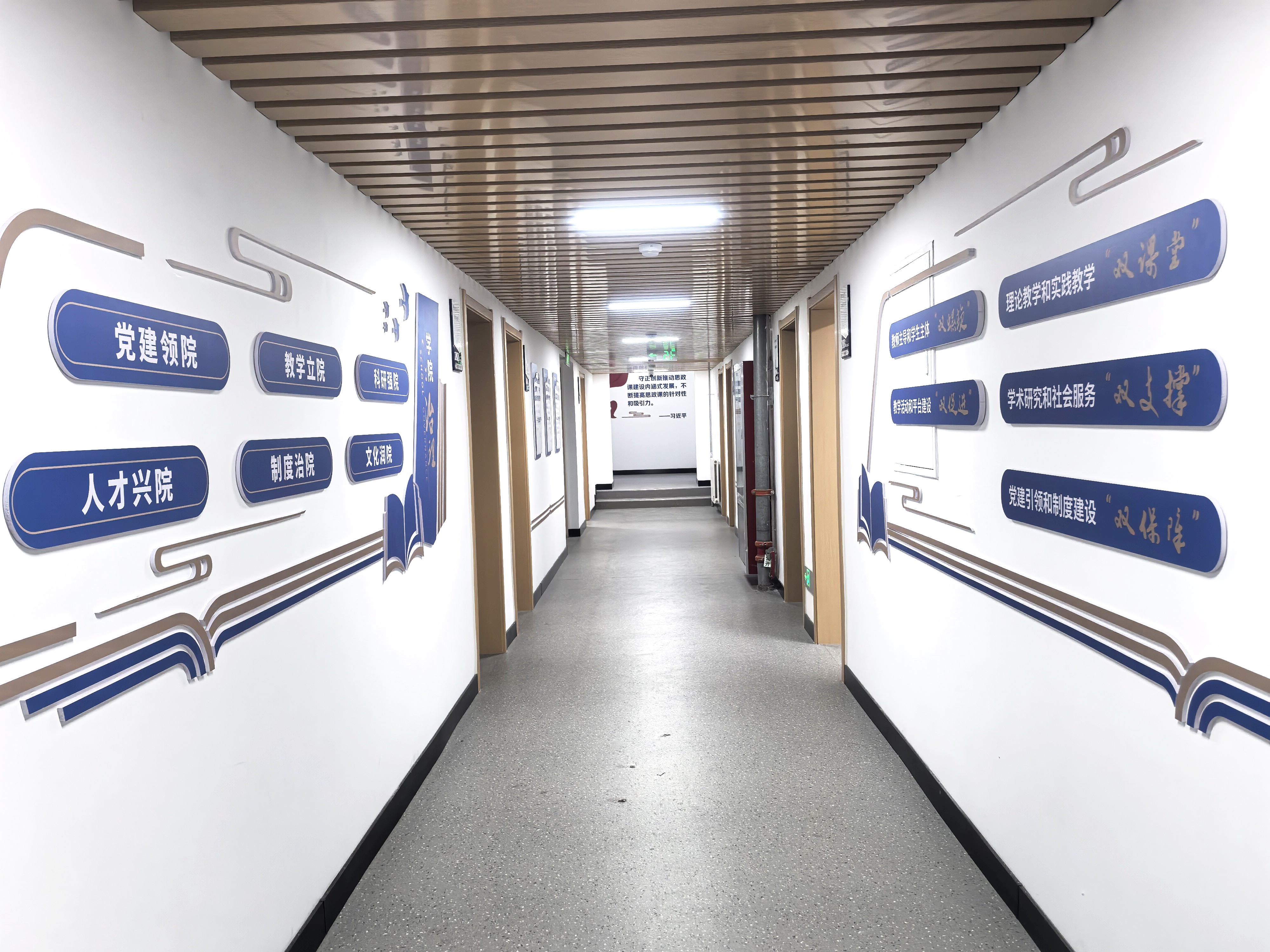 形象提升后,楼宇公共空间的内涵承载功能得到极大拓展和延伸。在楼道内,设计安装了院史墙、迎门屏风、马克思主义理论经典论述墙、政治文化走廊、教师成果展、学生成果展、学生风采展、宣传栏等模块;在集体备课室、多功能厅、教工之家、党员活动室等功能区,结合不同功能进行了主题鲜明、形式新颖的文化装饰,充分体现了马克思主义学院作为思政课建设坚强堡垒的深刻内涵、鲜明特色。