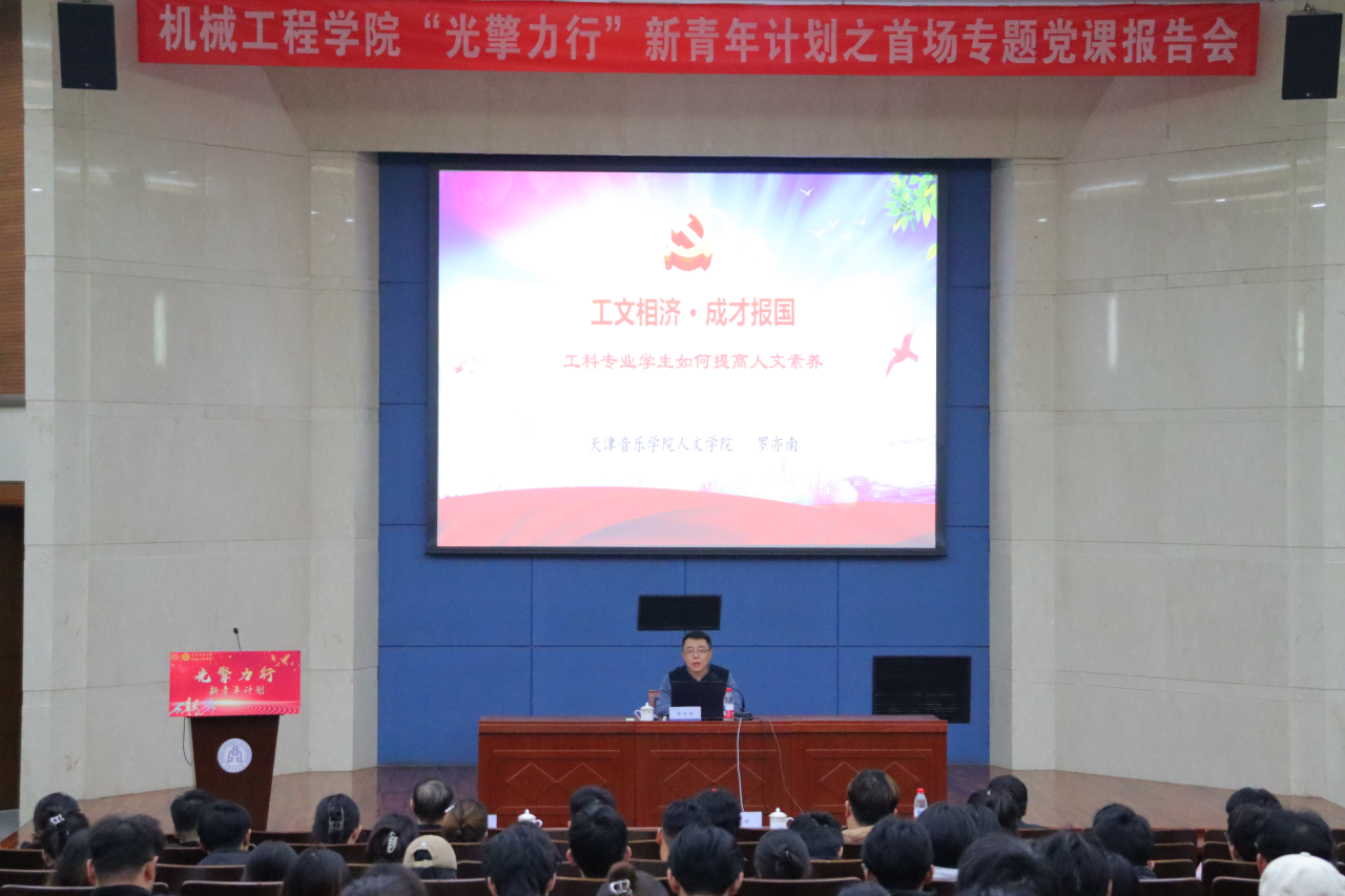10月30日下午,机械工程学院在图书馆国际报告厅举行“光擎力行”新青年计划品牌系列活动首场专题党课报告会。天津音乐学院人文学院党总支书记罗亦南应邀讲授专题党课,学院党委书记张莹、校关工委秘书长刘会洪出席报告会,学院师生党员、发展对象、入党积极分子等300余人参加。