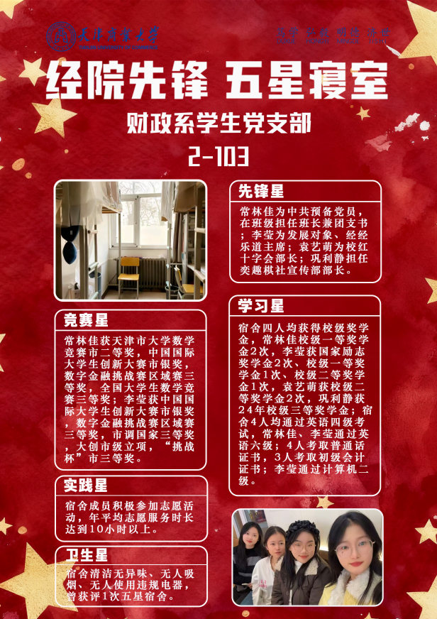 11月19日,经济学院开展“五星寝室”评比展示,围绕思想品德优、安全意识强、卫生状况好、学习风气正、社会实践佳等标准,评选出25间先进典型宿舍,充分发挥榜样带动作用,增强宿舍在大学生思想政治教育中的阵地功能。