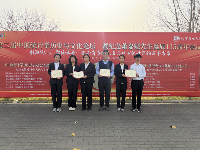 日前,我校经济学院经济统计学专业师生赴天津财经大学参加第二届中国现场统计研究会统计学历史与文化分会论坛暨纪念萧嘉魁先生诞辰115周年会议,在会议举办的多模态数字纪念活动竞赛及2025年“数据之美,统计之妙”最美统计图设计创新大赛中获得一等奖2项,二等奖1项,三等奖1项,专业教师郝枫教授与张圆副教授获得最佳指导教师奖。