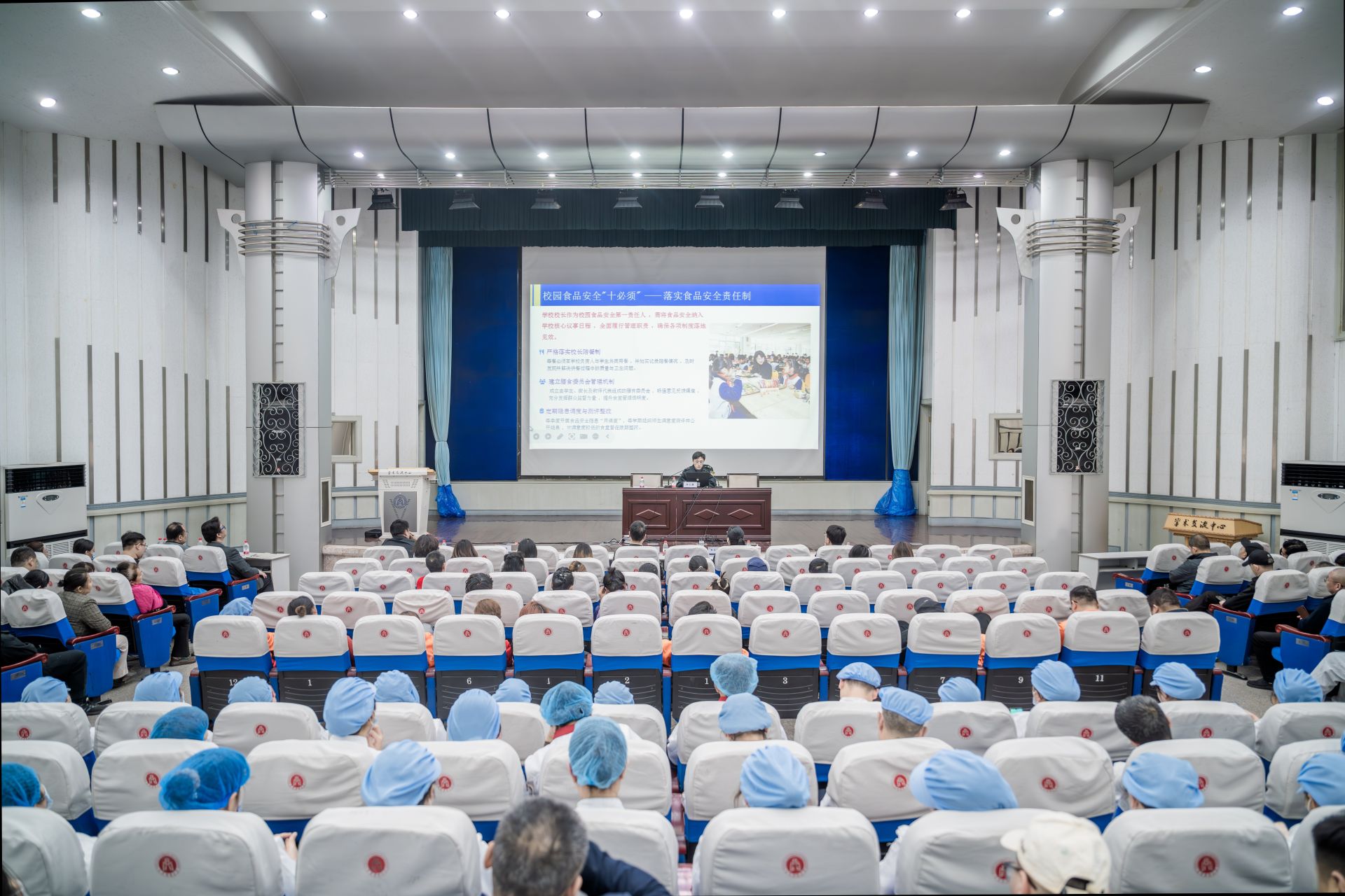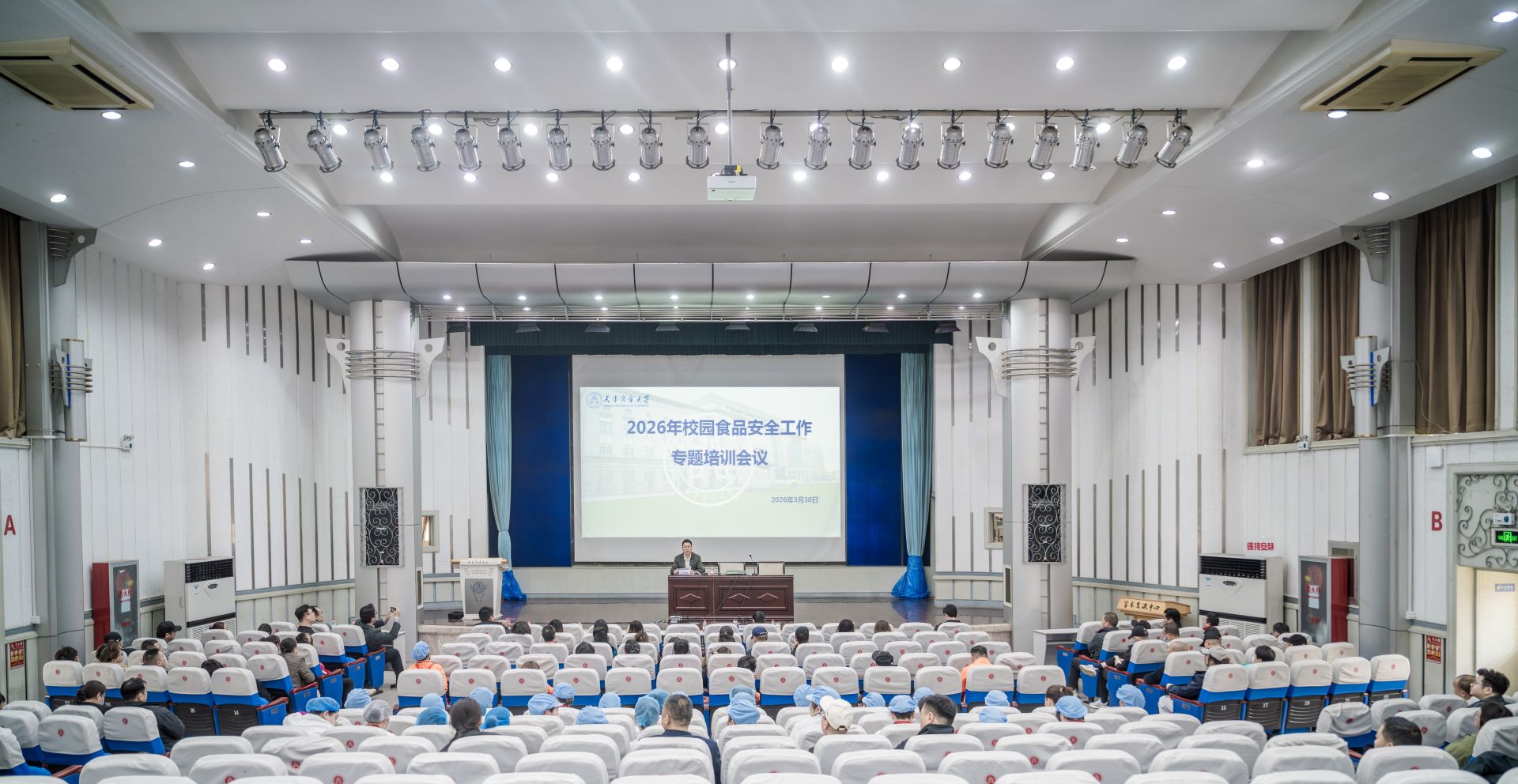 为深入贯彻食品安全“四个最严”要求,落实校园食品安全主体责任,规范食堂从业人员操作行为,3月30日下午,天津商业大学后勤处组织开展2026年校园食品安全工作专题培训。北辰区市场监督管理局副局长布江冬梅、食品科科长宋天水应邀出席,学校膳食中心管理组、食材配送中心管理组、自营及外包食堂约300名从业人员参加培训。