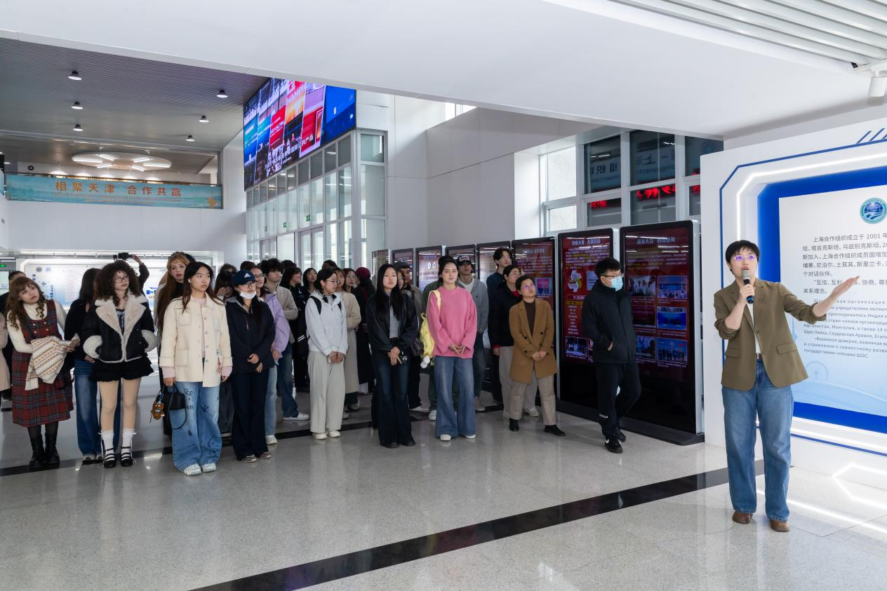 交流结束后,天津职业技术师范大学团委书记衣传波接待了调研团队以及我院学生党员、国际留学生一行50余人,带领大家实地参观“中国·上海合作组织职业技术教育中心”,让众人近距离感受我国职业教育的蓬勃发展。