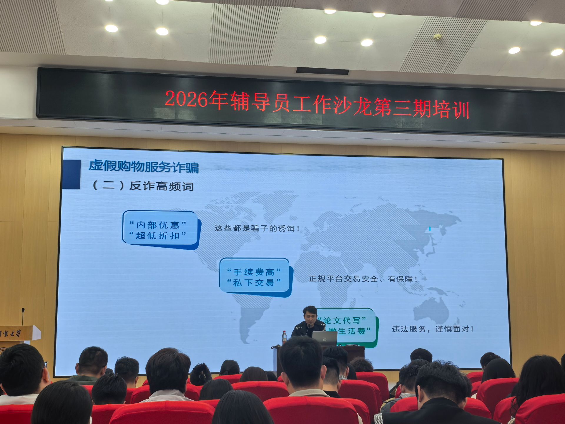 为进一步提升广大师生对电信网络诈骗的识别与防范能力,切实维护校园安全和师生财产安全,4月3日下午,党委学工部在七号教学楼就业宣讲厅组织开展2026年辅导员工作沙龙第三期培训暨防范电信网络诈骗专题培训。讲座特邀北辰区佳荣里派出所副所长段政兴担任主讲,全体辅导员及学生代表共同参加。