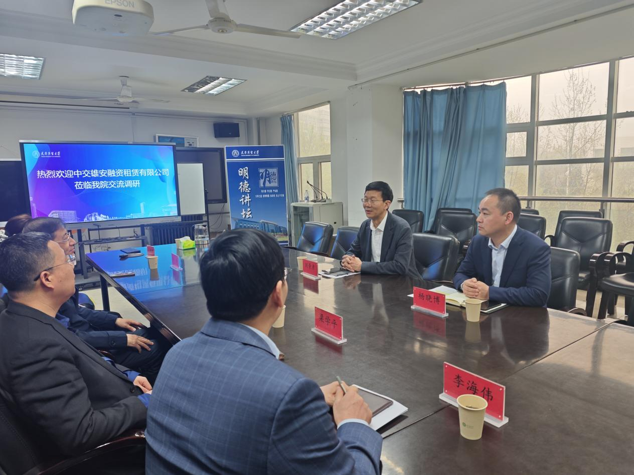 座谈会上,刘景彦首先介绍了中交雄安融资租赁有限公司的发展概况与未来规划。作为中交集团服务雄安新区建设发展的金融排头兵和主力军,公司始终坚持立足雄安、服务京津冀协同发展的理念,聚焦产业生态、集团生态、疏解生态等领域,为深入推进京津冀协同发展、高质量高标准建设雄安新区贡献中交力量。结合公司发展需求,刘景彦就双方后续校企合作提出三点建议:一是在行业交流、人才共育等方面开展深度合作,实现智库资源与企业实践的有机结合;二是在党建工作上开展深入交流与共建,推动党建与业务深度融合,以党建引领校企合作高质量发展;三是深化人才共育合作,聚焦学生实习、就业等关键环节,扎实推进校企协同育人与产教融合,实现人才培养与企业需求的精准对接。