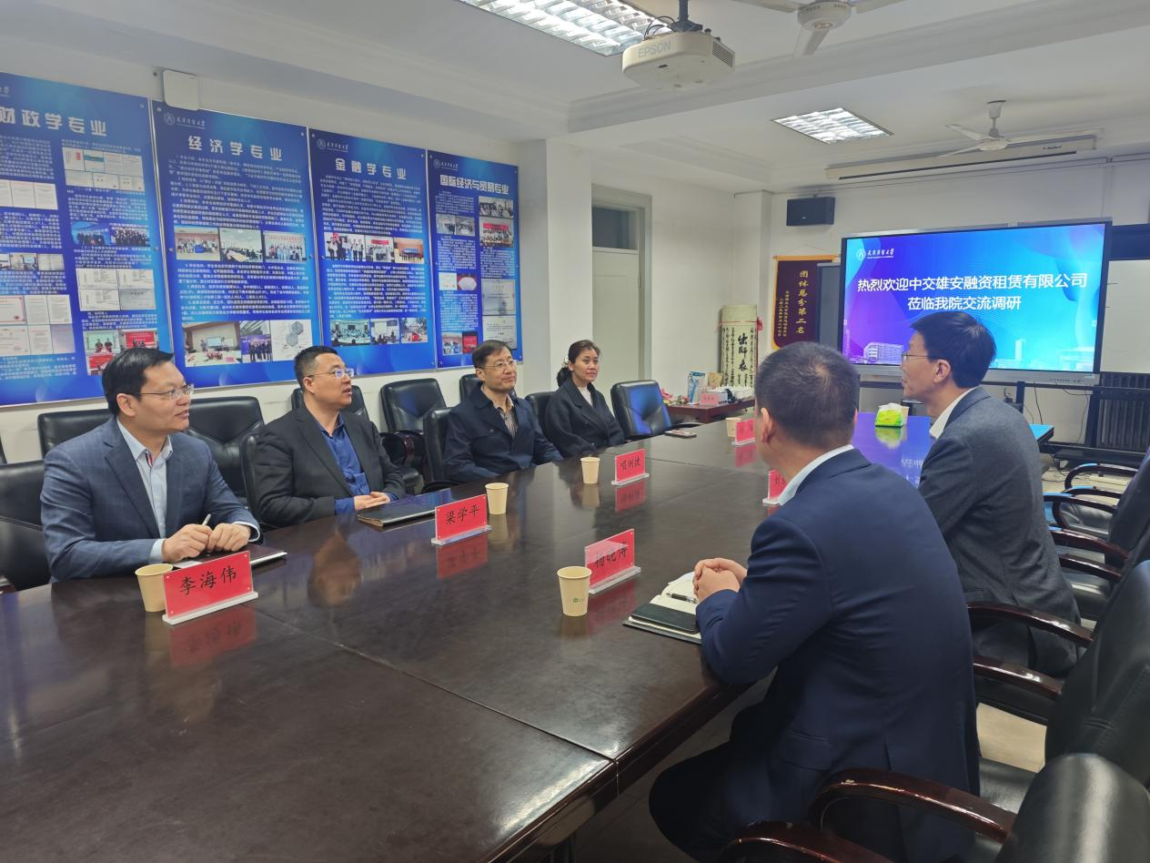 4月9日,中交雄安融资租赁有限公司党委副书记、执行总经理刘景彦,董事会秘书、党委工作部部长杨晓博一行莅临经济学院交流座谈。经济学院党委书记唱俐捷,院长梁学平,党委副书记孙瑶,副院长李海伟,金融系教师党支部书记、系主任聂艳明,政治经济学教研室主任王俊参会。双方围绕校企合作、党建共建等事宜深入磋商,共商合作发展新路径。