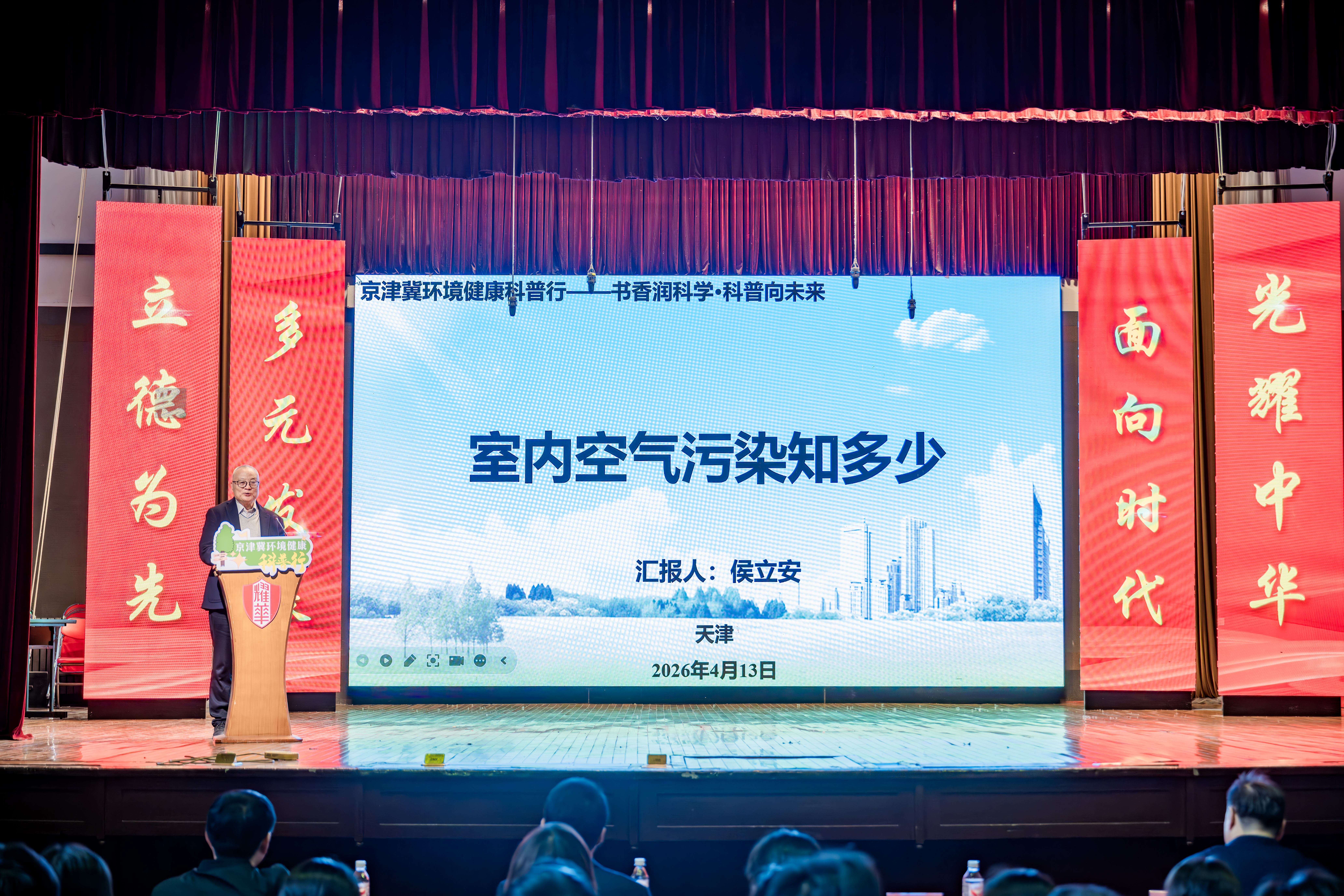 为深入贯彻国家生态文明建设和健康中国战略,充分发挥院士专家团队在科学普及中的引领作用,推动科普教育与思政教育深度融合,4 月 13 日下午,京津冀环境健康科普行首场活动 ——“书香润科学・科普向未来” 在天津市耀华中学成功举办。本次活动由我校与天津市科普思政研究会、天津市耀华中学联合主办,特邀中国工程院院士、环境工程专家侯立安进行科普书籍分享,为天津市多所中小学师生代表共计700余人带来一场兼具科学性与实用性的环境健康科普盛宴。天津市科学技术局党委委员、副局长谭振东,天津市科协党组成员、二级巡视员、天津科技馆党委书记(兼)侯建国,天津市耀华中学党委书记侯立瑛、校长李莉、和平区科技局副局长井新硕以及我校党委宣传部部长梁强等领导嘉宾出席活动。
