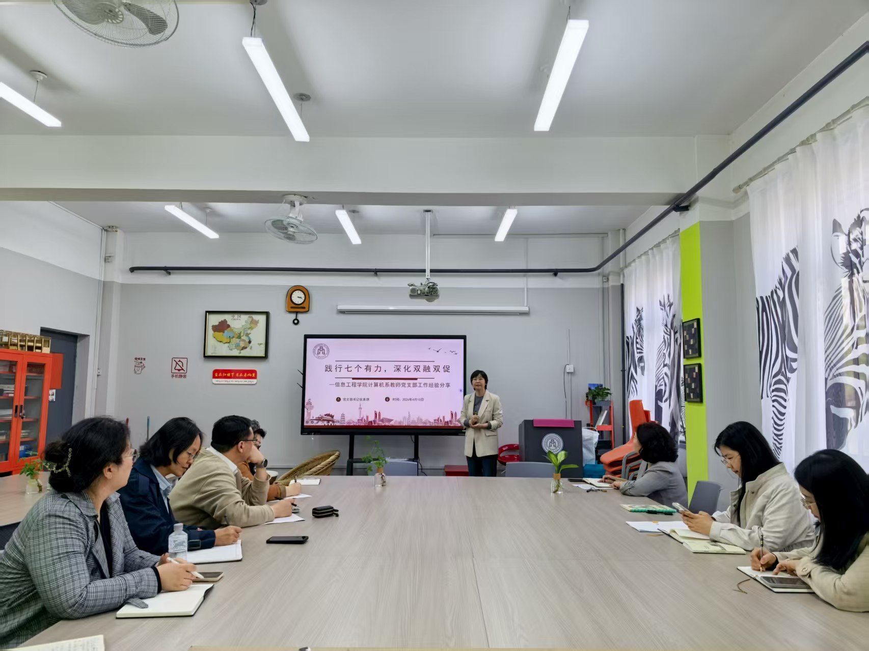 活动特邀天津市高校“双带头人”教师党支部书记“强国行”专项行动团队负责人、信息工程学院计算机系教师党支部书记张素琪作专题讲座。张老师以“践行七个有力,深化双融双促”为主题,紧扣“内聚外联促党建、知识联学促教育、工作联动促人才、问题连解促科技”四大核心维度,系统讲解了支部党建工作的实践路径、特色案例及未来工作思路。