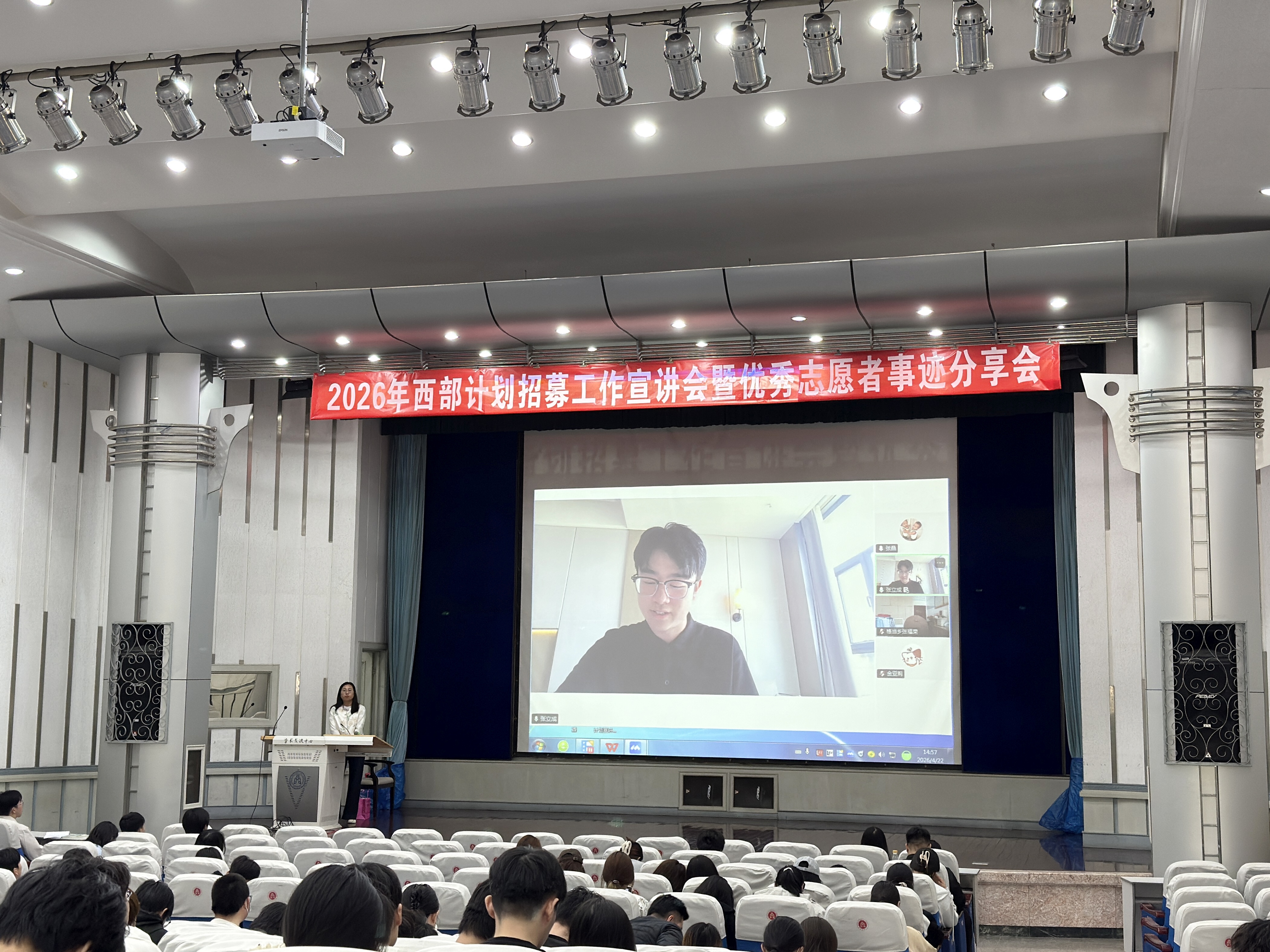4月22日下午,校团委在学术交流中心举办2026年西部计划招募工作宣讲会暨优秀志愿者事迹分享会。学校项目办负责教师对2026年西部计划实施方案进行了全面讲解,我校曾服务于西藏、新疆、兵团等地的5名优秀志愿者分享了各自的志愿服务初心与成长感悟,120余名学生参加分享会。