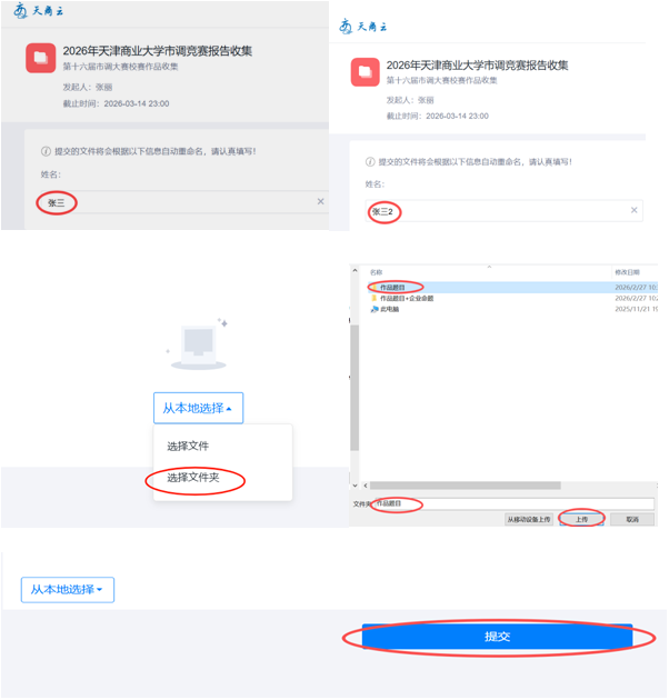 https://box.tjcu.edu.cn/collection/81b046a38d3be4fcb58951476c9429b1,姓名处填写队长姓名(提交后队长姓名不可更改),从本地点击选择文件夹后,点击“提交”。