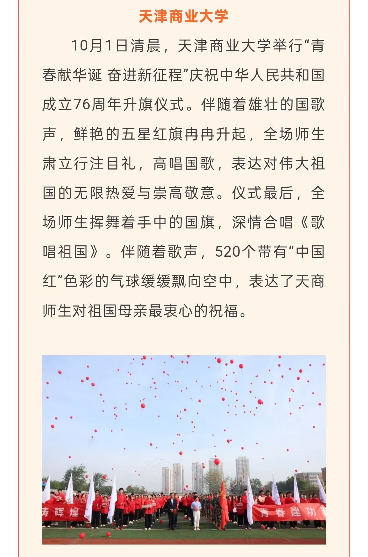 10月2日,天津教育报微信公众号报道学校国庆主题活动。 10月1日清晨,天津商业大学举行“青春献华诞 奋进新征程”庆祝中华人民共和国成立76周年升旗仪式。