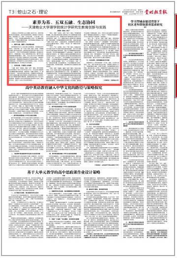 天津商业大学理学院立足立德树人根本任务,紧密对接数字经济发展趋势,依托学校商科优势,聚焦统计学研究生培养,系统构建了以“素养”为目标引领、“五双五融”为机制路径、“生态”为资源支撑的新型育人体系,有力破解学科交叉不足、产教融合薄弱等问题,为培养面向未来的高水平统计人才提供了可借鉴的实践样本。