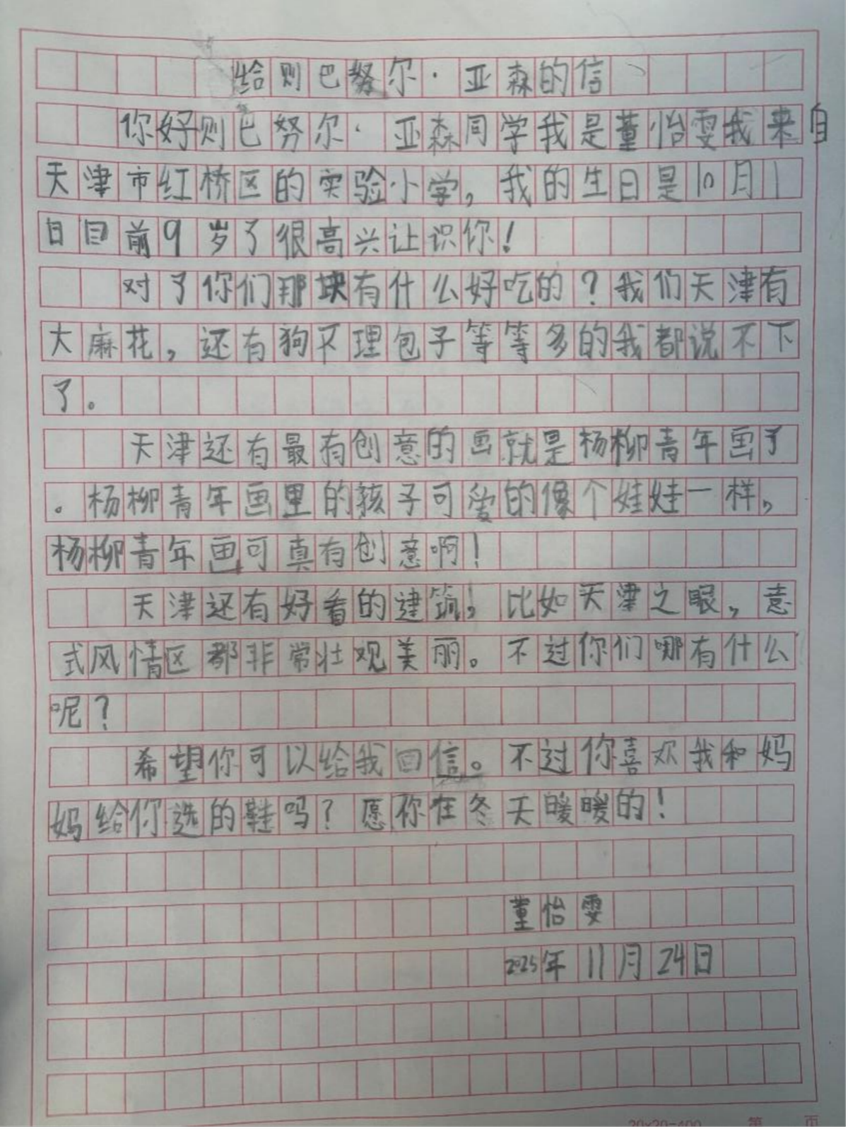 比物资更早抵达的,是发自心底的牵挂。许多师生在精心准备礼物的同时,不约而同地提笔写信。有大学生工整地写下大学生活的见闻,想为远方的孩子推开一扇窗;也有教师让家中孩子用拼音和图画参与进来,稚拙的笔迹里满是真诚:“新疆同学的名字真好听!”“你喜欢我和妈妈为你选的鞋吗?希望它能温暖你。”“期待你的回信,我在天津等你来。”