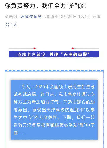 12月20日,天津教育报微信公众号、津云客户端报道我校考研期间暖心举措。