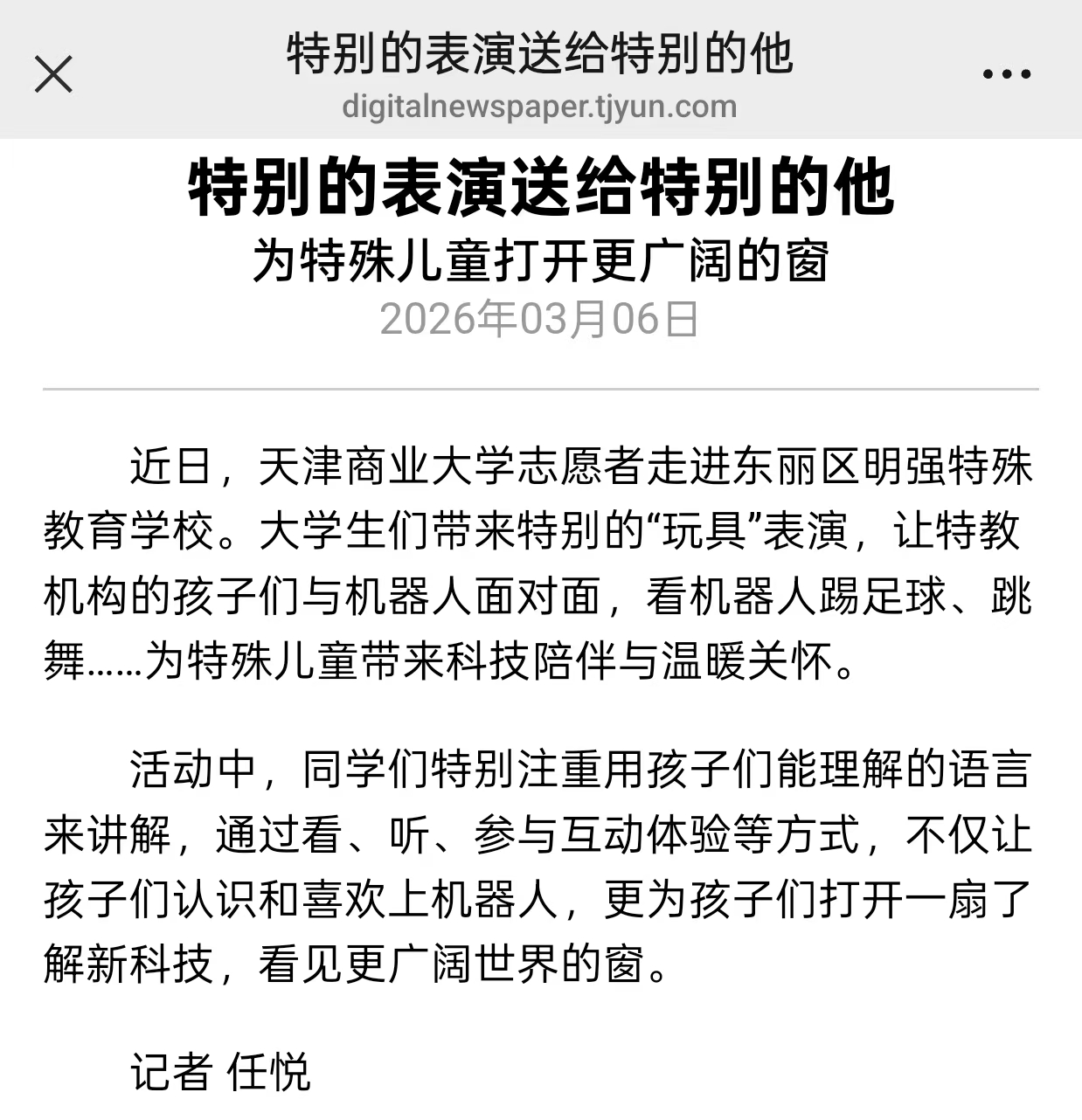 3月6日,《今晚报》、津云客户端报道我校志愿者走进东丽区明强特殊教育学校开展慰问表演。