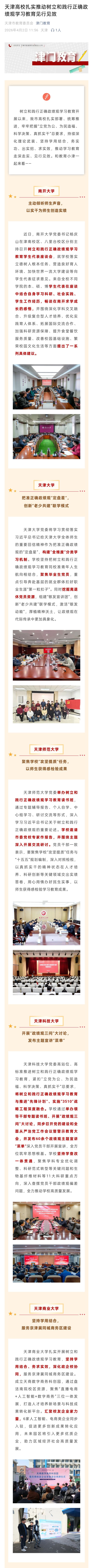 4月2日,津门教育微信公众号报道学校扎实开展树立和践行正确政绩观学习教育。我校扎实开展树立和践行正确政绩观学习教育,坚持学用结合、务求实效,深化政企校协同,服务京津冀同城商务区建设。成立天商数字商务科创园,通过盘活南院校区资源,聚焦“直播电商+人工智能+数字商务”三位一体发展,打造人才培养新场景与科技成果转化新平台。汇聚校友企业家力量,6家人工智能、电商类企业同步入驻,促进更多创新成果转化应用,未来园区将引入更多优质企业,助力区域经济社会高质量发展。