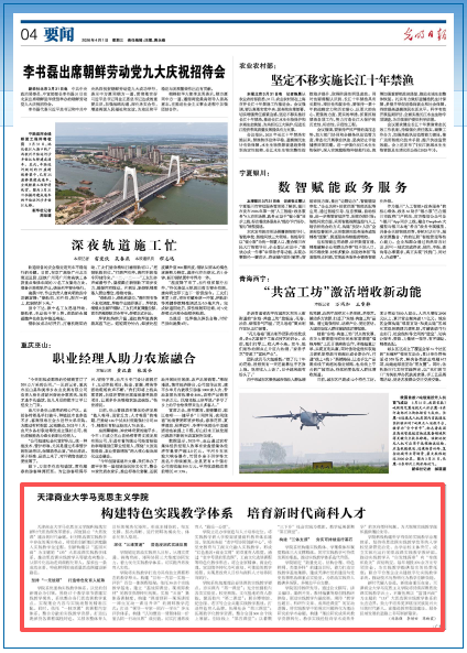 4月1日,《光明日报》报道我校马克思主义学院高质量思政课建设新路径。文章指出,天津商业大学马克思主义学院针对思政课实践教学中的现实难点,创新构建了以“富国兴商”为主题的“133”大思政课实践教学体系,通过坚持“一元统领”打造特色化育人矩阵、深化“三维贯通”营造浸润式实践氛围、构建“三体支撑”夯实可持续运行基石,将党的创新理论深度融入实践教学全过程,整合课内课外、校内校外、线上线下等多维课堂资源,形成了从零散到整合、从碎片化到课程化的育人新路径,有效提升了思政育人实效,为培养堪当民族复兴大任的时代新人探索出一条特色鲜明、成效显著的高质量思政课建设新路径。