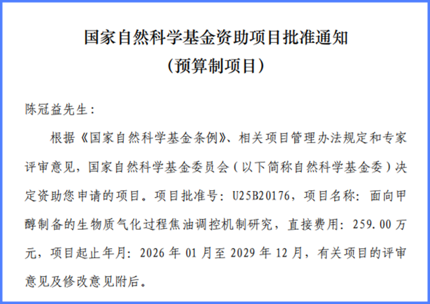 近日,国家自然科学基金委公布了2025年度国家自然基金企业创新发展联合基金重点支持项目评审结果,我校机械工程学院陈冠益教授申报的“面向甲醇制备的生物质气化过程焦油调控机制研究”项目获批立项,资助直接经费259万元。这是我校首次承担国家自然科学基金联合基金项目。
