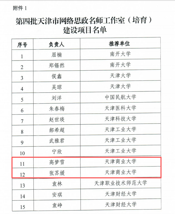 近日,市委教育工委、市教委印发《关于启动第四批天津市网络思政名师工作室(培育)建设工作的通知》,公布了第四批天津市网络思政名师工作室(培育)建设项目入选名单。我校机械工程学院辅导员高梦雪与马克思主义学院教师张苏媛主持的工作室成功入选。