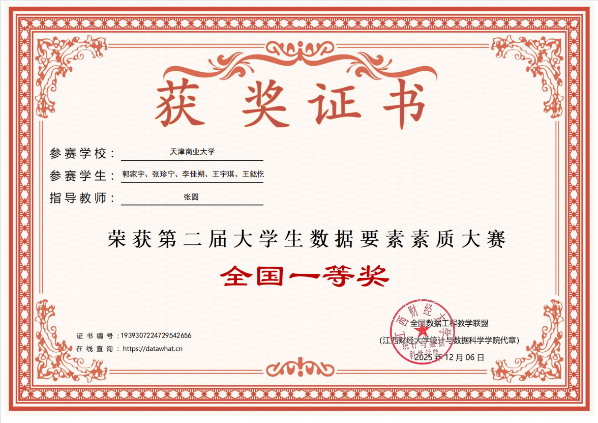 12月6日至7日,2025年(第二届)大学生数据要素素质大赛全国总决赛在江西财经大学圆满落幕,我校参赛的9支代表队取得优异成绩,获得全国一等奖1项,全国三等奖2项,天津市二等奖3项,天津市三等奖3项。