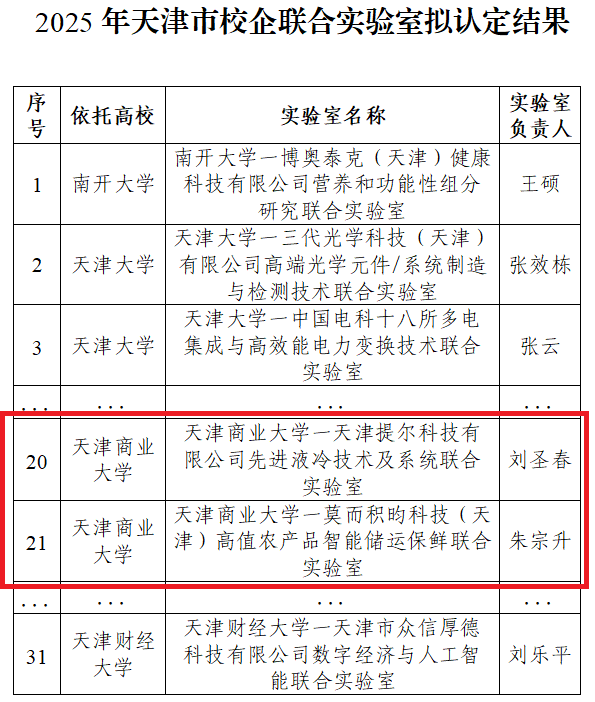近日,天津市教育委员会公布2025年天津市校企联合实验室认定结果,天津商业大学牵头申报的“先进液冷技术及系统联合实验室”与“高值农产品智能储运保鲜联合实验室”双双获批,标志着学校在聚焦产业需求、深化产学研协同创新领域再获重要突破,为区域经济高质量发展注入新动能。