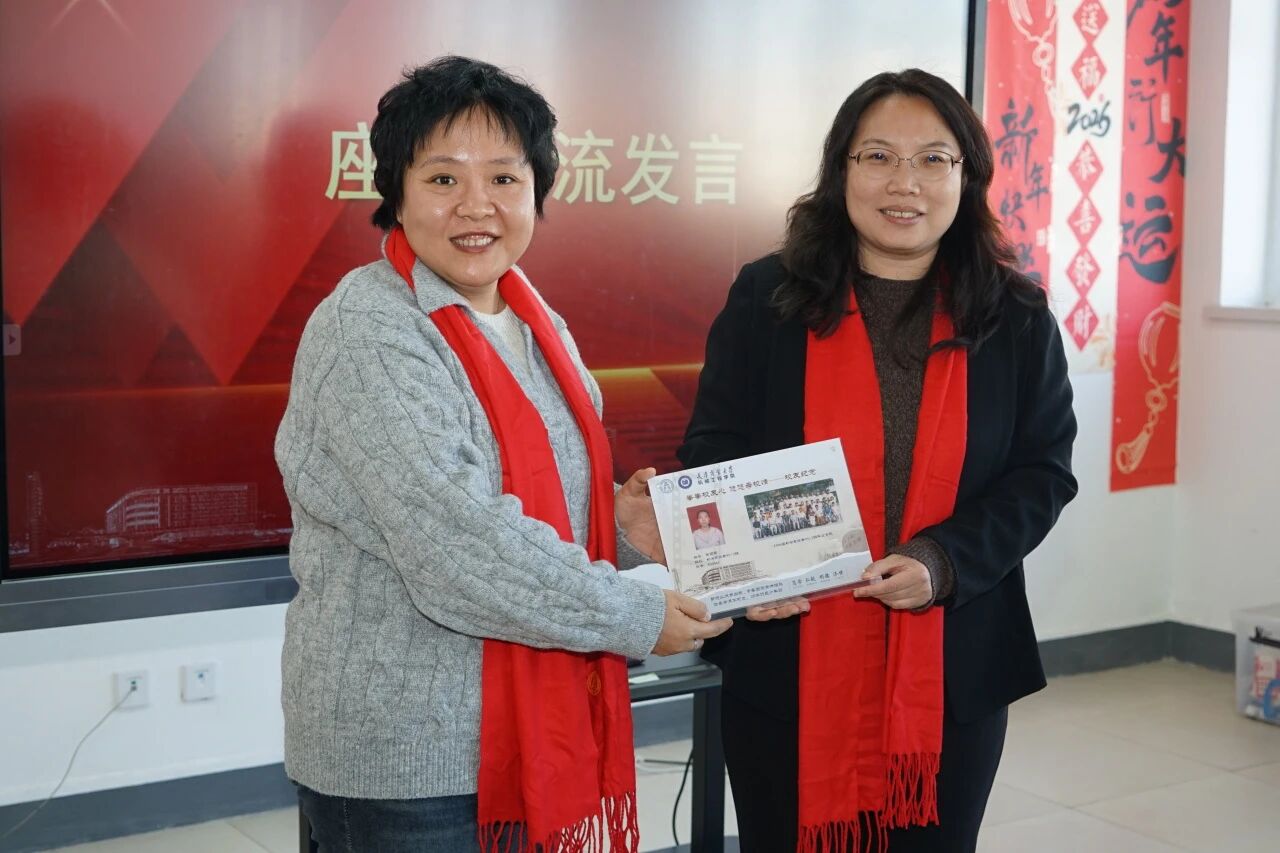 张莹为袁晖和张雪囡颁发校友返校纪念品。袁晖表示,正是学校的教育与熏陶,为他的事业发展奠定了坚实基础,这份积淀让他得以在奋斗中不断成长。张雪囡谈到,学院不仅教授了专业学识,更塑造了他踏实奋进的品格,这些始终是他前行路上的温暖力量与坚定底气。
