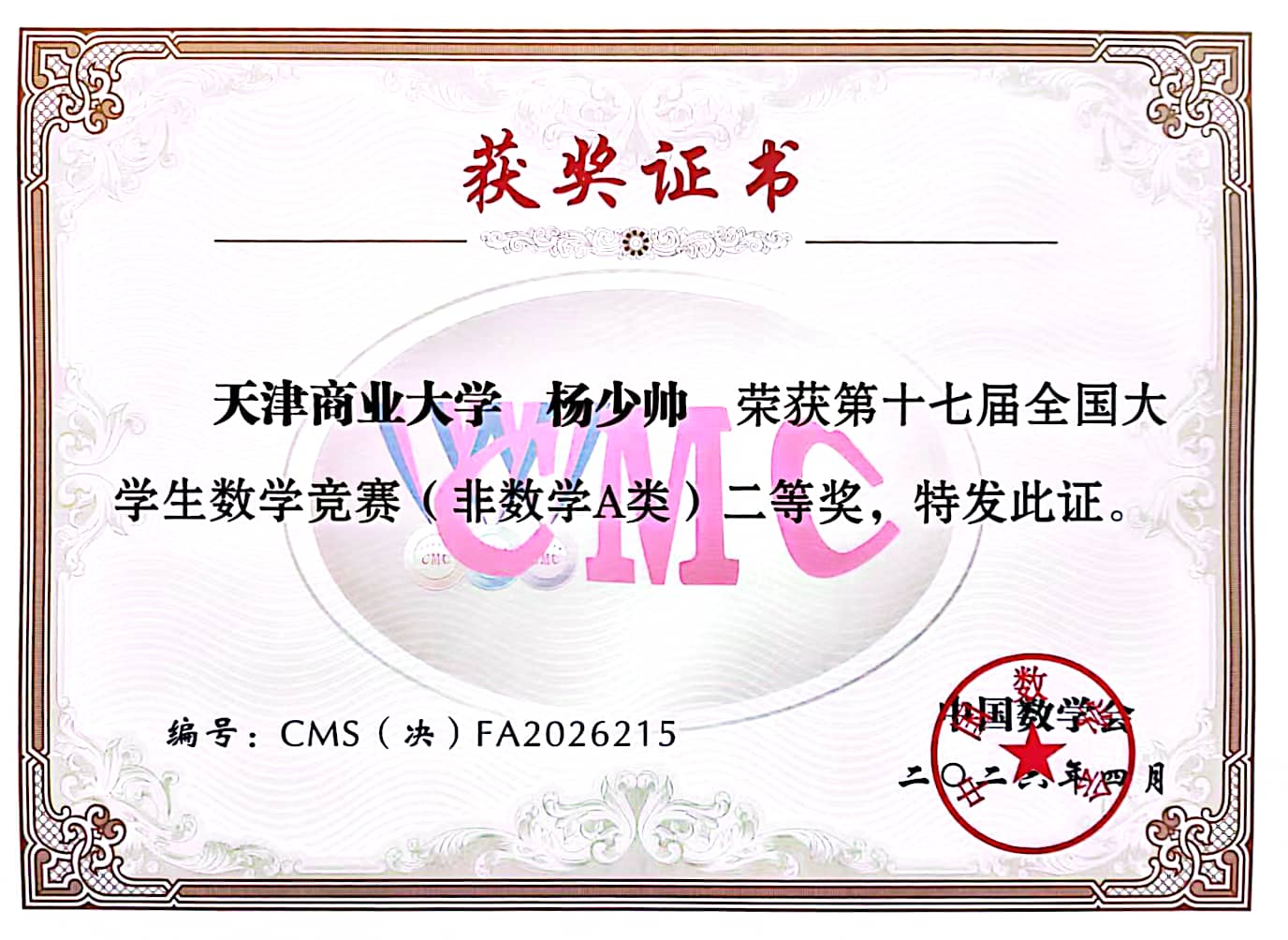 本届竞赛自2025年6月正式启动,共设32个赛区,吸引了来自北京大学、清华大学等全国1322所高校的35.2万余名本科生报名参赛,规模创历届新高。经过层层选拔,最终有千余名优秀学子脱颖而出,晋级全国决赛。杨少帅在非数学A类的激烈角逐中沉着应战,凭借过硬的专业能力从众多强手中突围,为学校赢得了荣誉。